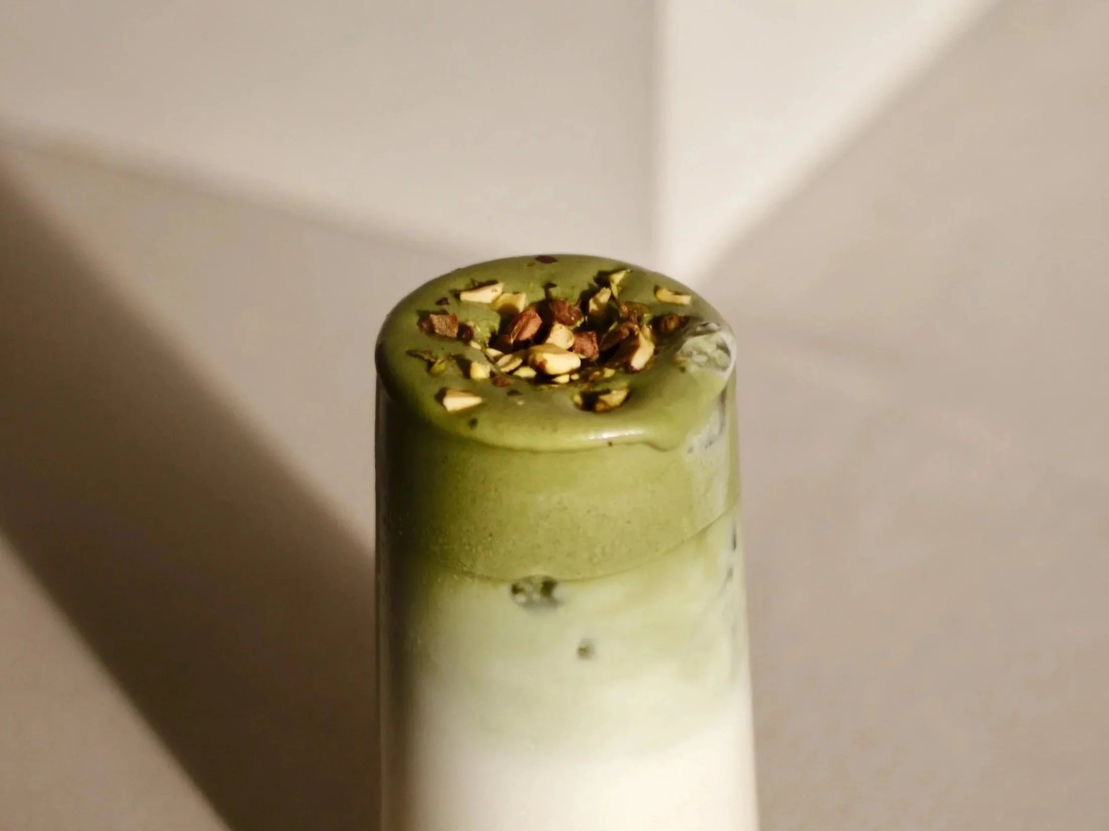 ceremonial matcha, pistachio syrup, oat milk, vanilla cold foam, pistachio topping.