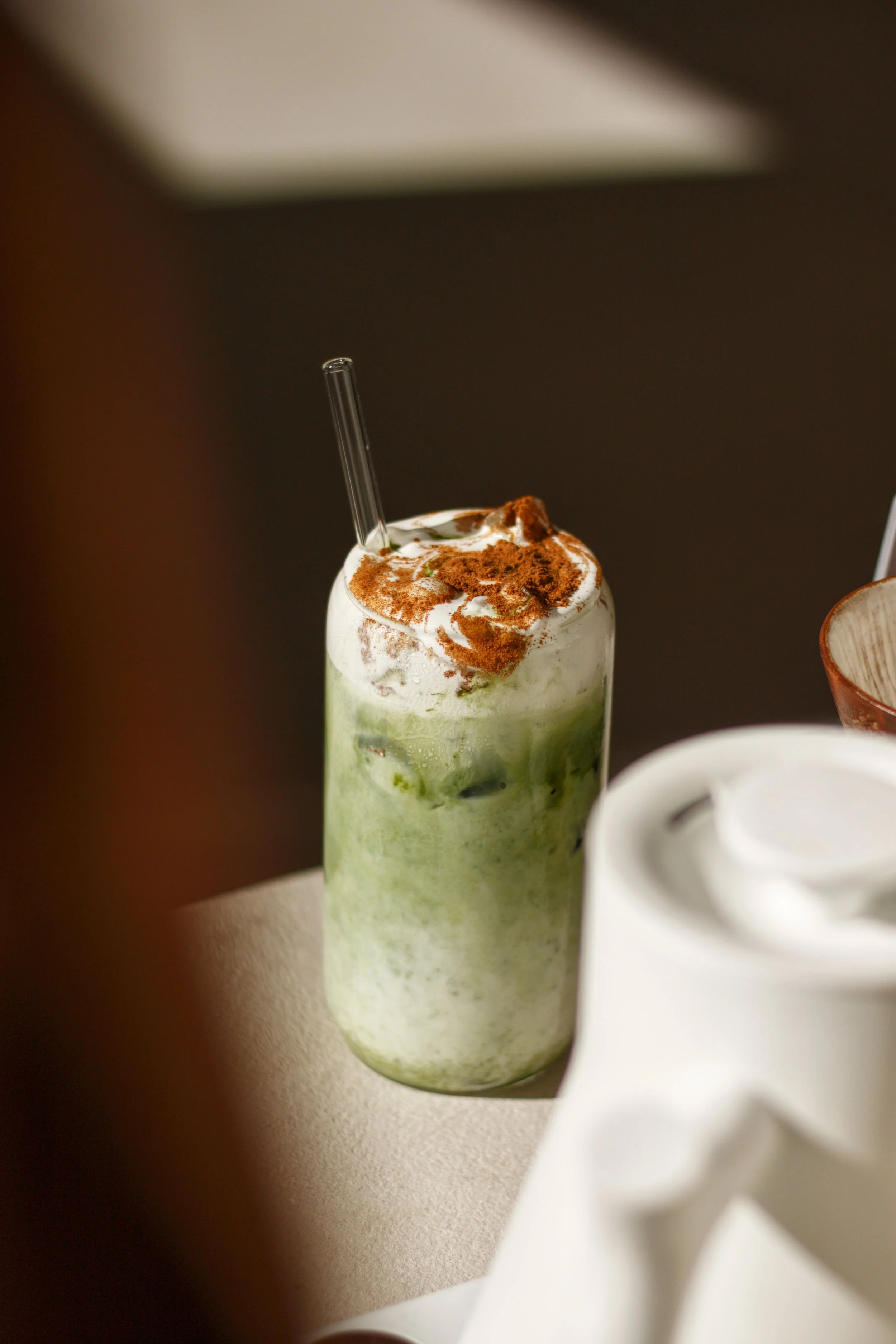 roasted matcha, macadamia syrup, vanilla cold foam, topped with cinnamon.